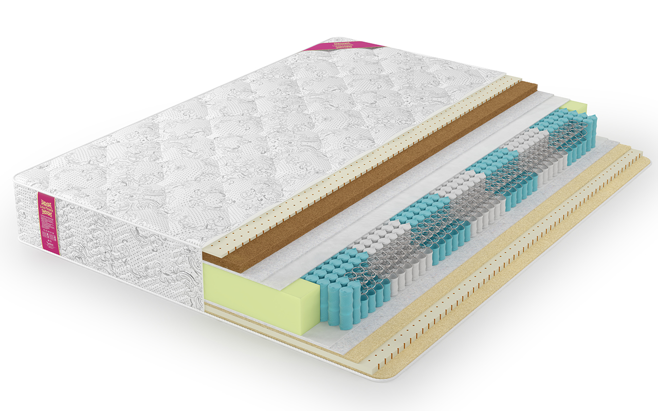 Наличие кокосовой койры толщиной 3 см. в составе придает матрасу жесткость, обеспечивает дополнительную поддержку позвоночника во время сна, формирует ортопедический эффект.